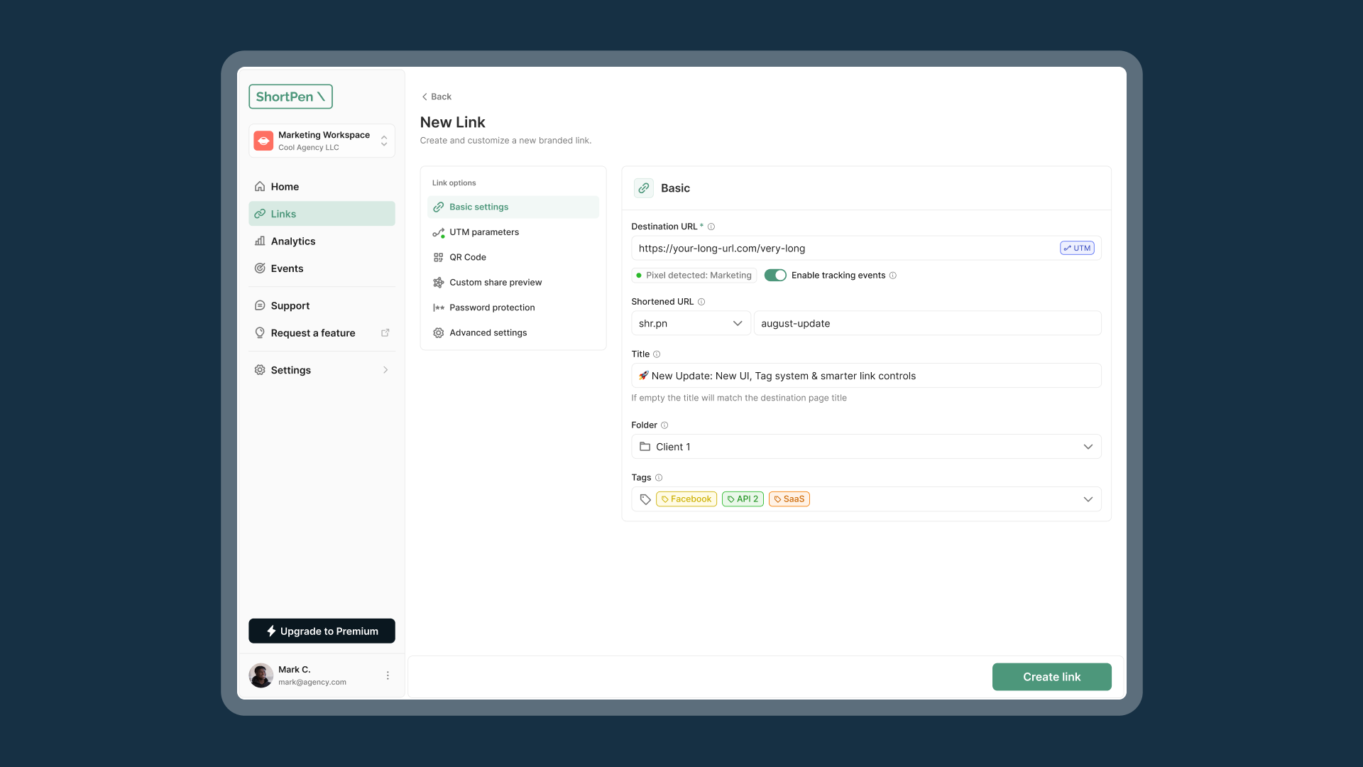 Modular interface with a quick mode for simple links and an advanced toggle for UTMs, QR codes, branded domains, and password protection.
